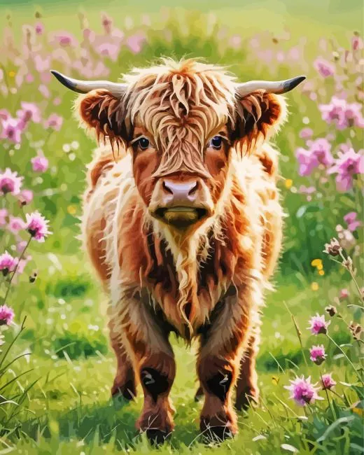 Fluffy Baby Brown Cow And Flowers Diamond Painting